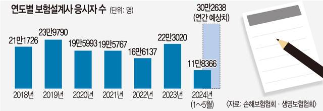 26일 국민일보가 황운하 조국혁신당 의원실을 통해 손해보험협회·생명보험협회에서 제출받은 자료에 따르면 지난달 손보·생보 설계사 응시자 수는 2만4846명으로 월 기준 최근 6년 새 최고치였다. 보험협회 관계자는 “10년 전까지 자료를 확인했을 때도 지난달 응시자 수가 가장 많았다”고 말했다.