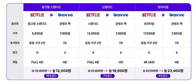 웨이브 요금제와 넷플릭스의 광고형 스탠다드·스탠다드·프리미엄 요금제가 각각 결합된 세 가지 상품 중 하나를 선택할 수 있으며 이는 넷플릭스와 웨이브를 따로따로 구독할 때보다 최대 10% 저렴하다.