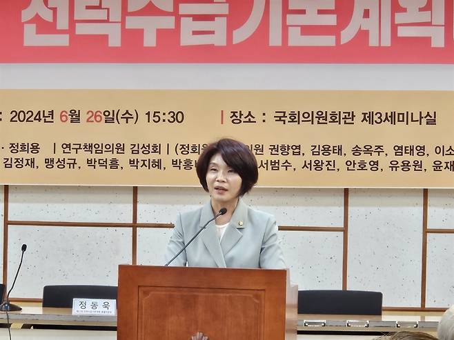 한정애 의원은 인사말에서, "우리는 지금 탄소중립의 시대와 AI 시대를 살고 있다. 국제에너지기구(IEA)는 데이터센터, 반도체, AI 등 관련 산업의 전력소비량이 2026년에는 2022년 대비 두 배가량 늘어날 것이다라고 했다. 전 세계적으로 AI 혁명이 일어나고 있고 우리나라도 예외일 수 없다"라고 말했다.