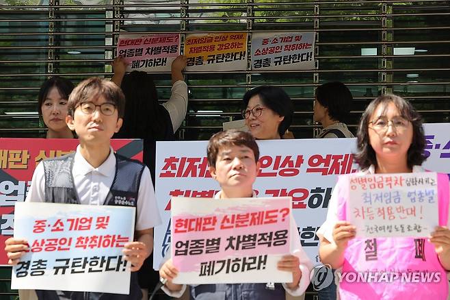 (서울=연합뉴스) 신현우 기자 = 전국민주노동조합총연맹 조합원들이 27일 오전 서울 마포구 한국경영자총협회(경총) 앞에서 기자회견을 열고 경총이 최저임금 인상을 억제하고 차별 적용을 강요한다며 이를 규탄하는 가운데 한 참가자가 손팻말을 경총회관 문에 붙이고 있다. 2024.6.27