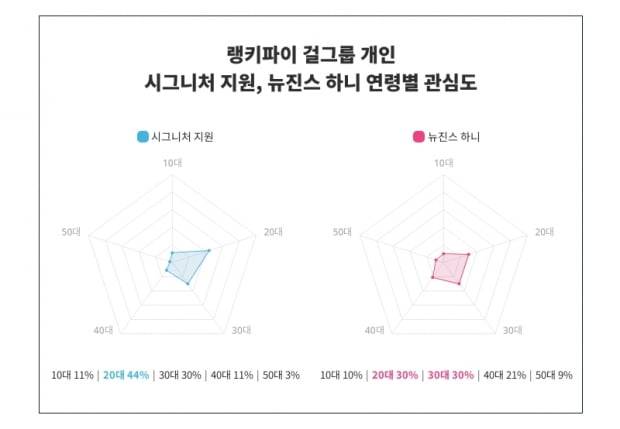 연령별 관심도 조사에서 시그니처 지원과 뉴진스 하니의 관심도가 다양한 연령층 사이에서 어떻게 분포되어 있는지 명확히 드러났다. 조사 결과, 시그니처 지원은 특히 20대에서 44%의 높은 관심도를 기록하며 가장 큰 관심을 끌고 있는 것으로 나타났다. 시그니처 지원의 인기는 10대 11%, 20대 44%, 30대 30%, 40대 11%, 50대 3%순으로 이어지며, 각 연령대별에서 어떠한 관심을 받고 있는지가 조사되었다.