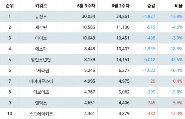27일 랭키파이는 자체적인 빅데이터 분석 프로그램을 통해 6월 4주차 기준 아이돌 그룹 트렌드지수를 공개했다.