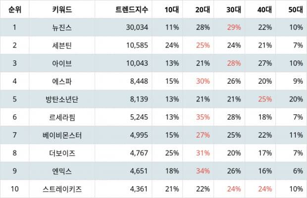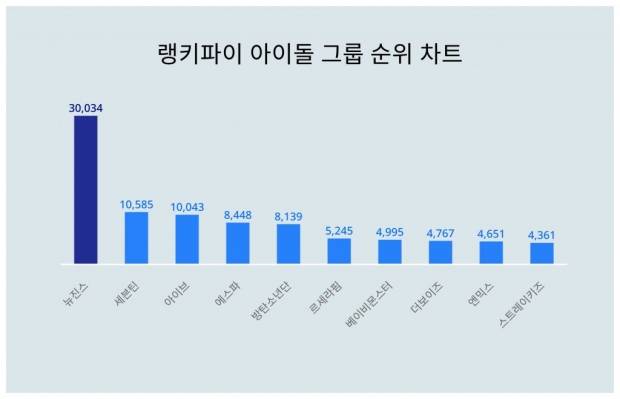 먼저, 뉴진스가 선두를 달리고 있다. 뉴진스는 아이돌 그룹 순위 내 30,034포인트를 기록해 1위로 꼽혔다.