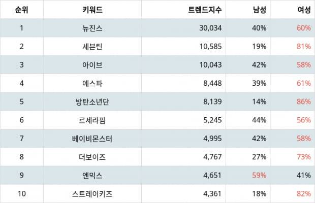 아이돌 그룹에서의 트렌드 순위는 성별 선호도에도 영향을 미쳤다. 1위를 차지한 뉴진스는 남성 40%, 여성 60%로, 여성에서 더 많은 선호를 보였다.