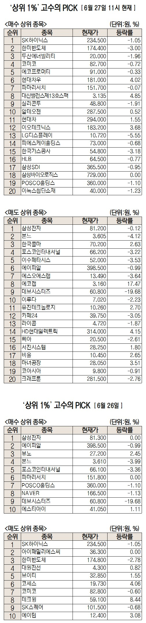 이날 미래에셋증권에 따르면 미래에셋증권 주식 거래 고객 중 최근 1개월 간 투자수익률 상위 1%에 해당하는 '주식 초고수'들이 오전 11시까지 가장 많이 사들인 종목은 SK하이닉스다.