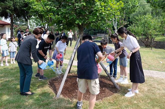 | ▲ 지난 5일 김건희 여사와 한화진 환경부 장관, 어린이들이 서울 용산어린이정원에서 열린 '어린이 환경·생태 교육관' 개관식에서 지난해 방한한 제인구달 박사가 식수한 산사나무에 물을 주고 있다. |