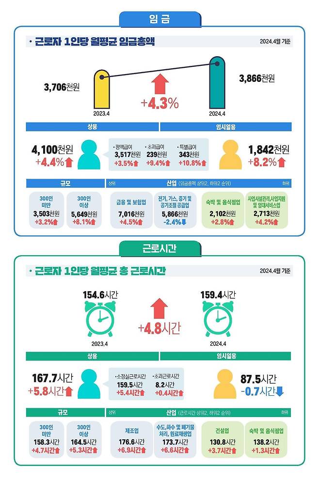 4월 근로자 실질임금 4.6만원 늘어 339만원…근로시간은 4.8시간 증가