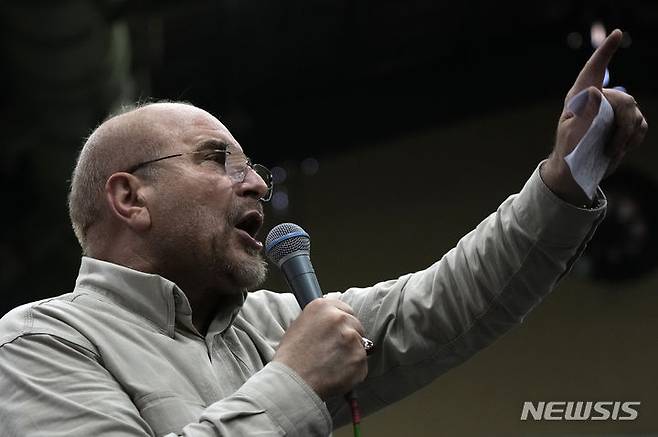 [테헤란=AP/뉴시스] 모하마드 바게르 갈리바프 이란 국회의장이 26일(현지시각) 테헤란에서 오늘 28일의 조기 대선을 앞두고 유세 연설을 하고 있다. 갈리바프 의장은 대선 후보 중 가장 서열이 높은 인물로, 대선 가도에서 선두를 달리고 있는 것으로 평가된다. 2024.06.27.