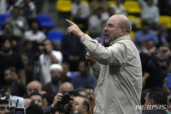 [테헤란=AP/뉴시스] 모하마드 바게르 갈리바프 이란 국회의장이 26일(현지시각) 테헤란에서 오늘 28일의 조기 대선을 앞두고 유세 연설을 하고 있다. 갈리바프 의장은 대선 후보 중 가장 서열이 높은 인물로, 대선 가도에서 선두를 달리고 있는 것으로 평가된다. 2024.06.27.
