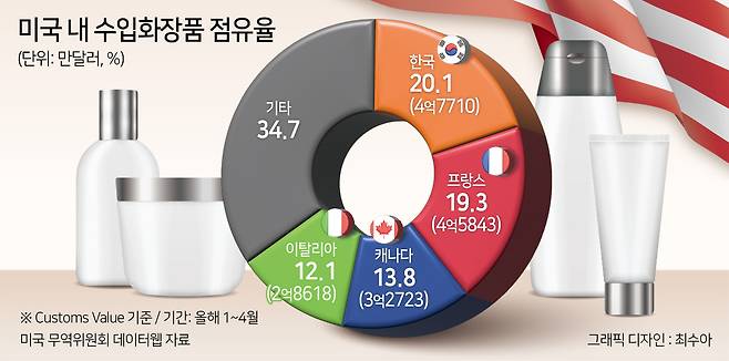 지난해 미국의 화장품 수입액 점유율 순위(USITC, 데이터웹, 관세가격 기준)는 1위 프랑스(17.3%), 2위 한국(16.5%), 3위 캐나다(15.5%)였다.