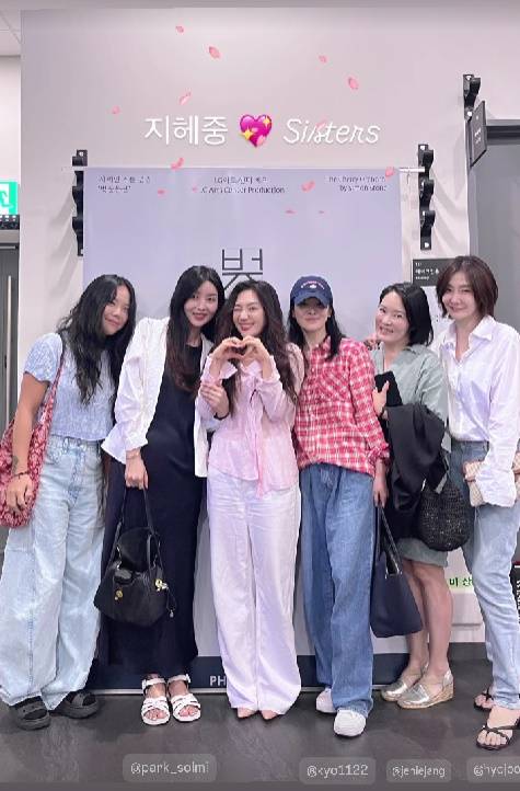 송혜교는 SBS 드라마 '지금 헤어지는 중입니다'에서 인연을 맺은 배우 최희서가 출연하는 연극 '벚꽃동산'을 관람했다. 편안한 옷차림을 한 송혜교는 박효주, 박솔미 등과 포즈를 취하고 있다.