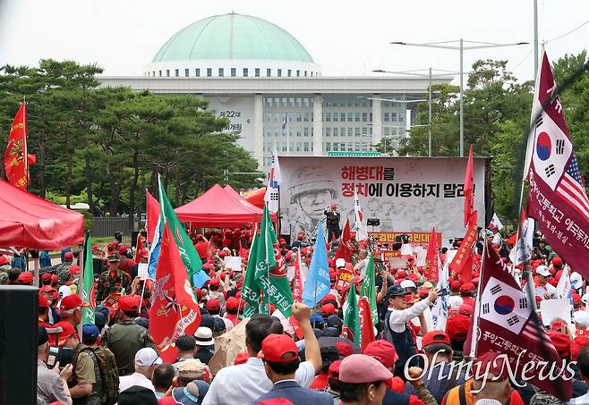 대한민국 해병대 예비역단체들이 27일 오후 서울 영등포구 국회 앞에서 '채상병 특검법 관련 야권 비판 총궐기대회'를 하고 있다. 집회 참석자들은 "해병대원의 명예로운 희생을 빌미로 야당이 대통령 특검과 탄핵을 주장하는 등 지난 1년간 해병대가 정치의 제물이 되어 망신스러운 모습으로 도배됐다"고 주장하며 해병대를 정치에 이용하지 말 것을 요구했다.