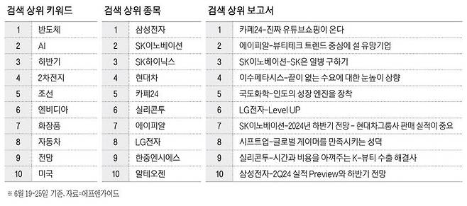 한 주 동안 투자자들 주목도가 높았던 종목은 삼성전자와 SK이노베이션, 그리고 SK하이닉스였다. 검색이 가장 많았던 보고서는 유튜브 내 쇼핑 서비스를 제공하는 카페24 관련 보고서였다. 키워드 검색 순위에서는 반도체와 인공지능(AI)이 각각 1위와 2위를 차지했고, 7월을 앞두고 하반기가 3위에 올랐다.