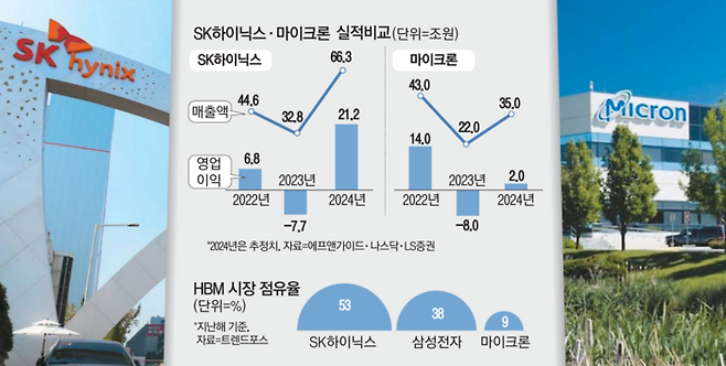 특히 인공지능(AI) 특수로 고성장 중인 고대역폭메모리(HBM) 시장에서도 마이크론은 3위다. 트렌드포스에 따르면, 지난해 말 기준 압도적 1위는 SK하이닉스로 점유율이 53%에 달한다. 삼성전자가 38%이며 마이크론은 9%에 불과하다.