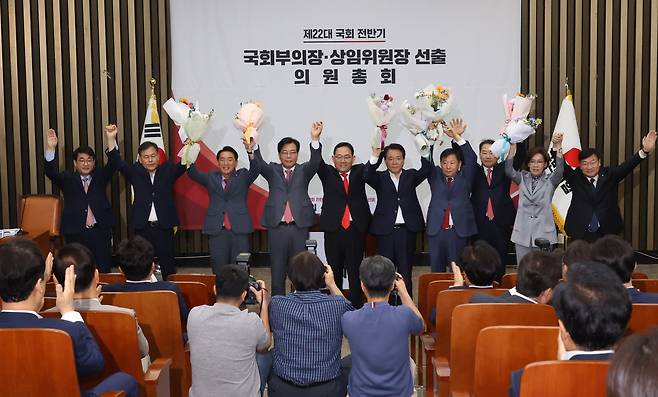 | ▲ 제22대 국회 전반기 국회부의장 후보에 당선된 국민의힘 주호영 의원과 윤한홍 정무위원장 후보자, 김석기 외통위원장 후보자, 송언석 기재위원장 후보자, 성일종 국방위원장 후보자, 이철규 산업통산자원중소벤처기업위원장, 신성범 정보위원장 후보자, 이인선 여성가족위원장 후보자가 27일 오전 서울 여의도 국회에서 열린 의원총회에서 축하꽃다발을 들어보이며 동료 의원들에게 인사하고 있다. |