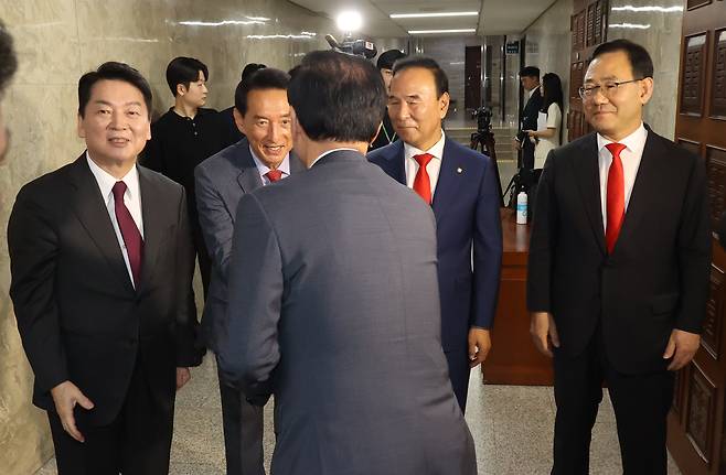 | ▲ 제22대 국회 전반기 외통위원장 선출에 나선 안철수, 김석기 의원과 국회부의장 선출에 나선 박덕흠, 주호영 의원이 27일 오전 서울 여의도 국회에서 열린 의원총회에서 동료의원들에게 지지를 호소하며 인사를 나누고 있다. |