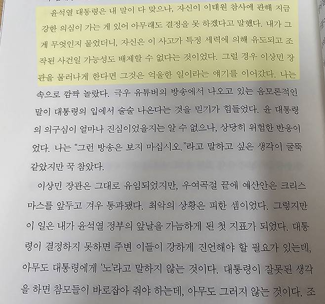 그는 "내가 그게 무엇인지 물었더니, 자신(윤 대통령)은 이 사고가 특정 세력에 의해 유도되고 조작된 사건일 가능성도 배제할 수 없다는 것이었다"라며 "그럴 경우 이상민 장관을 물러나게 한다면 그것은 억울한 일이라는 얘기를 이어갔다"라고도 적었다. 윤 대통령이 10.29 이태원 참사의 배후에 다른 '세력'이 존재하고, 이에 의해 '조작'됐다는 가능성을 진지하게 고려했다는 것.