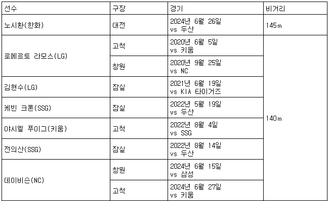 비거리 140m 홈런은 2020년대 들어 KBO리그에서 9번째로 나왔다.