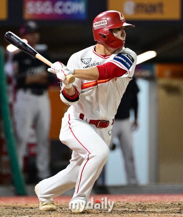 [마이데일리 = 유진형 기자] 27일 인천 SSG랜더스필드에서 '2024 신한 SOL Bank KBO리그' KT 위즈와 SSG 랜더스의 경기가 열렸다. SSG 정준재가 9회말 무사 1.2루서 2루수 땅볼을 치고 있다.