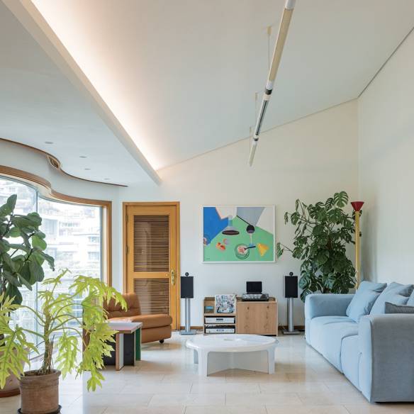 빌라 내부는 거실과 방 3개, 화장실 3개를 갖춘 구조지만 하나의 방에 연결된 또 다른 방이나 2층 다락방, 방마다 마련된 크고 깊숙한 붙박이장 등 넉넉한 서비스 공간을 갖추고 있다. 김민정은 인테리어 디자이너 마미지와 함께 집을 다듬어보기로 했다. 마미지 디자이너는 이전에도 클랩 스튜디오의 사무실 디자인을 진행하며 김민정과 가족의 취향을 잘 알고 있었다. 마미지 실장은 맑은 질감의 바닥 타일과 단단한 오크 무늬목, 유리블록 벽 등 오래된 기본재를 최대한 살려 복잡한 공사를 최소화하고 아이코닉한 디자인 가구와 고경애 작가의 매력적인 페인팅 작품을 더해 분위기를 정돈해 나갔다.