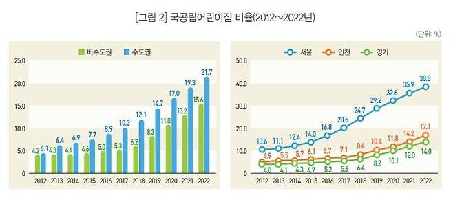 수도권 전체 어린이집 중 국공립 어린이집 비율은 2017년에 10%대에 진입한 뒤 꾸준히 늘어났다. 2022년에는 21.7%로 높아졌으나 여전히 부족한 수준이다. 수도권의 국공립 어린이집 비율은 비수도권보다 매년 높게 나타나며 두 권역 간의 차이는 2012년에 1.9%p에서 2022년에 6.1%p로 점차 늘어나고 있다.