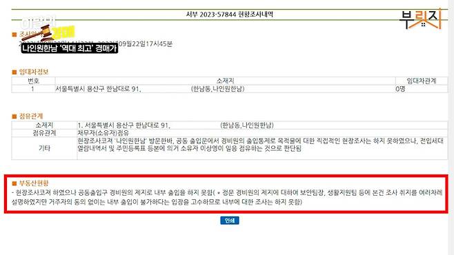 여기서 또 약간 좀 약간 별개의 얘기인데요. 이 사건을 보면 보안이 또 얼마나 철저한지는 알 수가 있습니다. 원래 이제 경매로 나오면 그 법원에서 집행관에게 현황 조사 명령을 내리거든요. 현장 조사를 하고자 공동 출입문 갔으나 경비원의 제지로 내부를 출입하지 못했다. 보안 팀장이라든지 생활지원팀장들에게 취지를 여러 차례 설명했지만 동의 없이는 단지 안으로 들어가지 못한다 이런 회신이 있어서 결국은 법원에서 하는 그런 집행 과정임에도 불구하고 내부로 전혀 못 들어갔다고 합니다.