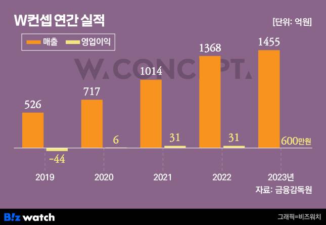 W컨셉의 수익성도 악화하는 추세다. W컨셉의 연결 기준 매출액은 지난해 1455억원을 기록하며 성장세를 유지했지만 영업이익은 528만원에 그쳤다. 이는 전년(31억원)과 비교해 99.8% 감소한 수치다.