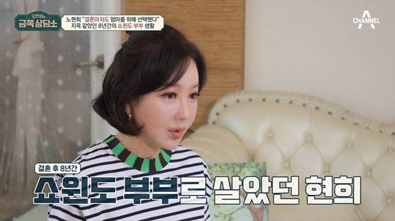 결혼 당시를 떠올린 노현희는 "결혼했을 때 '눈물의 결혼식'이라는 타이틀의 기사들이 났다. 식장 입장 전부터 눈물이 마르질 않더라. 계속 울었다. 하고 싶어서 한 결혼이 아니었다. 엄마하고 원수처럼 지내지만, 효도 한번 하려고 엄마가 원하는 사위를 선택해서 결혼했다"고 털어놨다. 그러면서 "쇼윈도 부부로 8년간 살았다. 밖에선 행복한 척하고 집은 지옥이었다"고 고백해 안타까움을 자아냈다.