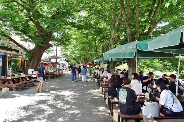 관방천 둑길이 더욱 흥미로운 건 관방제림에 이어 맛집 명소가 된 국수거리가 이어지는가 하면, 5일마다 담양장터가 펼쳐져서다. 무더운 여름날이지만 바로 아래 관방천이 흐르고 둑길가에 푸른 녹음이 우거진 나무들이 그늘을 드리워주어 거닐만하다.