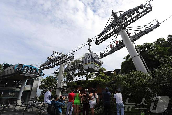 (메데인 AFP=뉴스1) 우동명 기자 = 26일(현지시간) 콜롬비아 메데인에서 케이블카 끼리 충돌해 한대는 추락하고 한대는 공중에 매달린 모습이 보인다. 2024.06.28