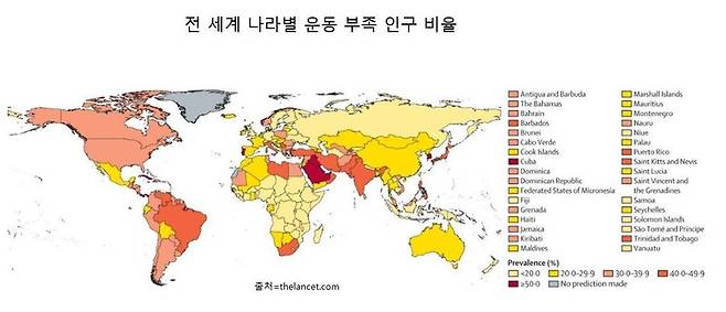 나라별로는 중동의 아랍에미리트연합이 66.1%로 가장 높았고, 아프리카의 말라위가 2.7%로 가장 낮았다. 조사 대상 163개국 가운데 운동 부족 인구 비율이 50%를 넘는 나라는 한국과 아랍에미리트를 포함해 쿠웨이트(63.3%), 쿠바(61.1%), 레바논(58.6%), 파나마(57.6%), 카타르(53.5%), 이라크(52.0%), 사우디아라비아(51.5%), 포르투갈(51.7%) 10개국이다.