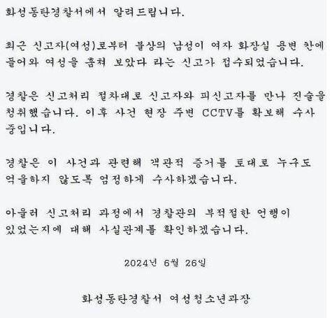 이 사건을 접한 누리꾼들은 “무죄 추정의 원칙은 어디 갔나”, “경찰의 태도가 강압적”이라는 비판이 쏟아졌고, 항의가 쏟아지자 화성동탄경찰서는 여성청소년과장 이름으로 입장문을 냈다.