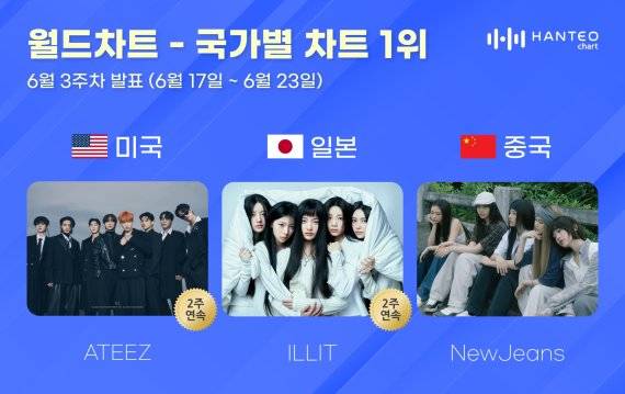그룹 에이티즈(ATEEZ)와 아일릿(ILLIT), 뉴진스(NewJeans)가 한터차트에서 발표하는 6월 3주 차 국가별 차트에서 각각 정상을 차지했다.