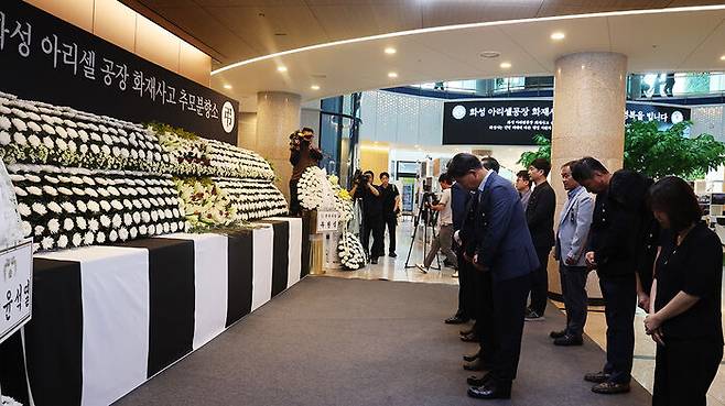 ▲ 28일 경기도 화성시청에 설치된 아리셀 공장 화재 사고 추모 분향소에서 추모객이 희생자들을 추모하고 있다.