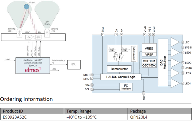 HALIOS® 전용의 시그널 컨디셔너 IC인 E909.23은 제스처 컨트롤 어플리케이션을 위해 개발되었으며, 특히 저전력의 차량용 터치 디스플레이에 최적화된 제품이다. E909.23의 기능은 기본적으로 감지 대상의 물체로부터 반사된 빛줄기 (광선)를 대조군의 빛줄기와 비교하여 물체를 가장 정확하게 감지하는 것이다. 그와 더불어, 외란광에 내성이 강하여 간섭을 거의 받지 않으며, E909.23가 적용된 어플리케이션 시스템의 라이프타임 내내 자율적으로 캘리브레이션을 이행하여 물체 감지 시 더욱 향상된 감도를 유지한다.