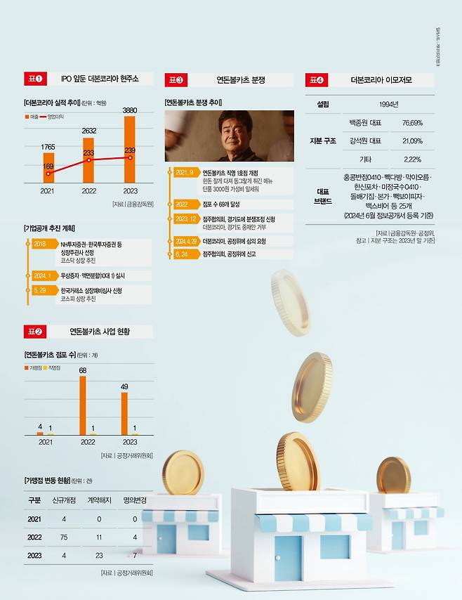 백종원 대표가 이끄는 '더본코리아'가 복병을 만났다. 창립 30주년을 맞은 올해 코스피 상장을 목표로 기업공개(IPO)를 추진하고 있지만, '연돈볼카츠' 일부 점주와 갈등이 심화하고 있어서다(표➊). 연돈볼카츠는 더본코리아가 2021년에 론칭한 외식 브랜드다. 제주에 1호점(직영점)을 연 후 1년 만에 가맹점이 68개까지 늘었지만 지난해엔 49개로 감소했다.