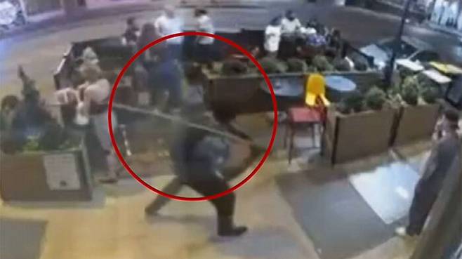 그런데 지나가던 행인이 가만히 서 있던 한 남성 손님의 뒤통수를 향해 갑자기 들고 있던 막대기를 휘두릅니다.