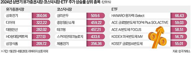 올 상반기 국내 증시에서 인공지능(AI) 반도체 수혜주 종목과 K뷰티·K푸드 수혜주들이 상승률 상위권을 휩쓴 것으로 나타났다. 상장지수펀드(ETF) 상품도 AI 반도체 관련 종목들이 상위권을 차지했다.