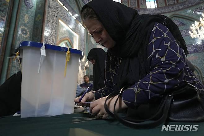 [테헤란=AP/뉴시스] 28일(현지시각) 이란 테헤란의 한 투표소에서 여성 유권자가 대통령 보궐 선거 투표를 하고 있다. 2024.06.28.
