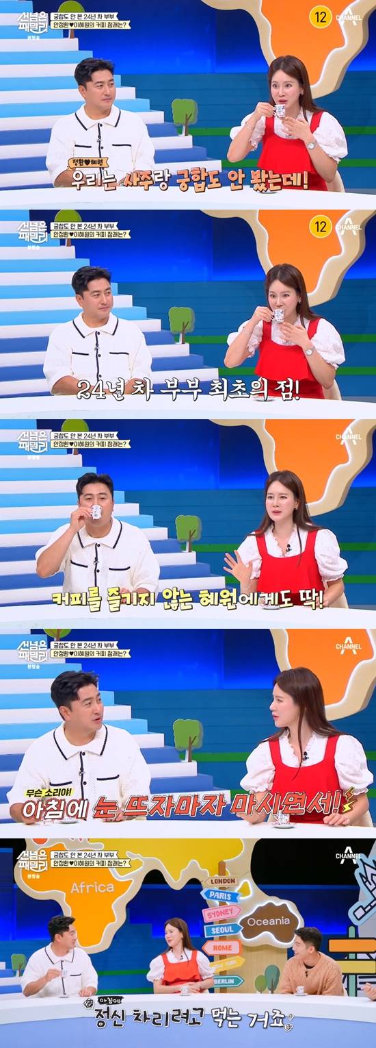 이혜원이 "커피를 그렇게 좋아하진 않는데 맛있다"고 커피 맛을 평가하자, 안정환은 "무슨 소리냐. 눈 뜨자마자 마시면서"라고 반박했다.