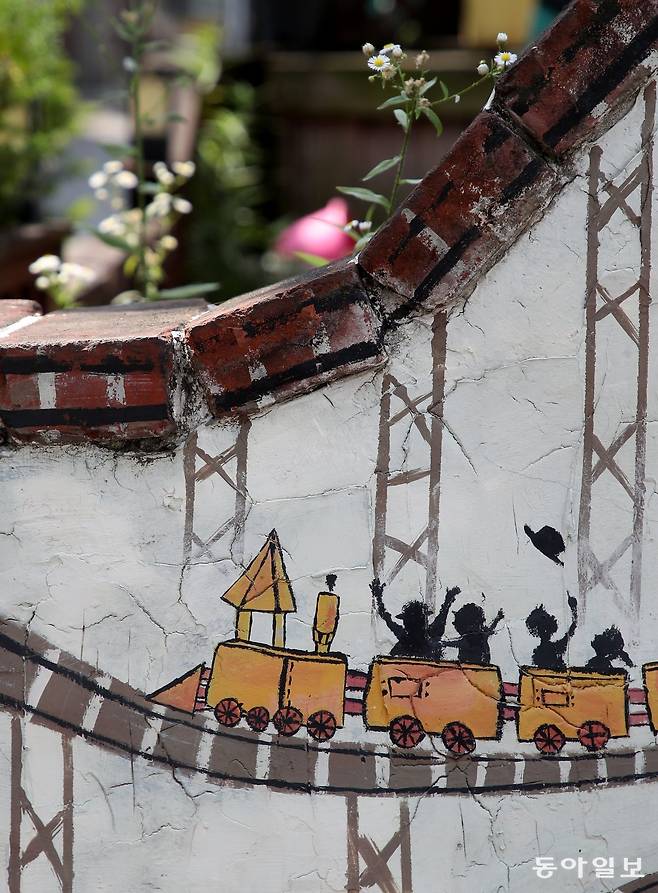 누가 오래된 담벼락에 이렇게 예쁜 그림을 그렸을까요? 기차에 탄 아이들의 환호성이 들리는 듯해요.