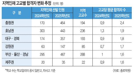 최저기준을 충족하지 못해 정시로 이월하는 인원도 변수다. 가톨릭관동대, 한림대, 울산대 등 9개 의대는 정시 모집에서 모든 인원을 전국 단위로 선발한다. 대입이 진행되는 와중에 정시에서 지역인재 전형을 따로 만들기 어렵다. 따라서 이들 대학은 이월 인원 전부를 전국 단위로 뽑을 것으로 보인다.