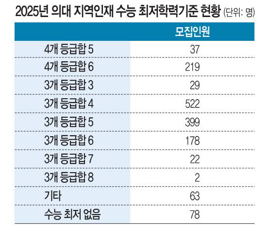 2025학년도 의대 지역인재 전형 선발 인원은 1549명인데, 78명(5%)만 최저기준을 두지 않았다. ‘3개 등급합 4’를 요구한 전형의 모집 인원이 522명(33.7%)으로 가장 많았다. 국어·수학·영어·탐구 중 등급이 높은 3개 영역을 적용하는데, 1개 영역에서만 2등급을 허용하고 나머지는 1등급이어야 한다는 말이다. 예컨대 국어·수학 1등급, 영어 2등급이면 통과인 엄격한 기준이다. ‘3개 등급합 5’가 다음으로 많은 399명(25.8%)이다. 이어 ‘4개 등급합 6’이 219명(14.1%)으로 뒤를 이었다.