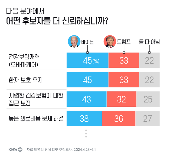 바이든 대통령은 정반대의 정책을 추구합니다. 이미 재임 중 메디케이드 자격 소득 수준과 가입 절차를 완화해 가입자를 크게 늘렸습니다. 2022년 승인한 '인플레이션감축법'을 통해 국가가 의료비 80%를 지원하는 메디케어가 제약회사와 약값을 직접 협상해 가격을 낮출 수 있도록 근거를 마련했습니다. 이런 성과들을 노인층 공략에 적극 활용한다는 게 바이든 캠프의 계획입니다. 비영리 의료단체 KFF의 5월 여론조사에서 유권자 10명 중 7명은 메디케이드가 지금처럼 유지되길 원했고, 3명은 연방정부 지원금을 제한하고 주 정부가 더 유연하게 보험을 설계하도록 변경하는 공화당 방안을 지지했습니다. 수치로 보면 민주당에 유리한 조사 결과입니다.