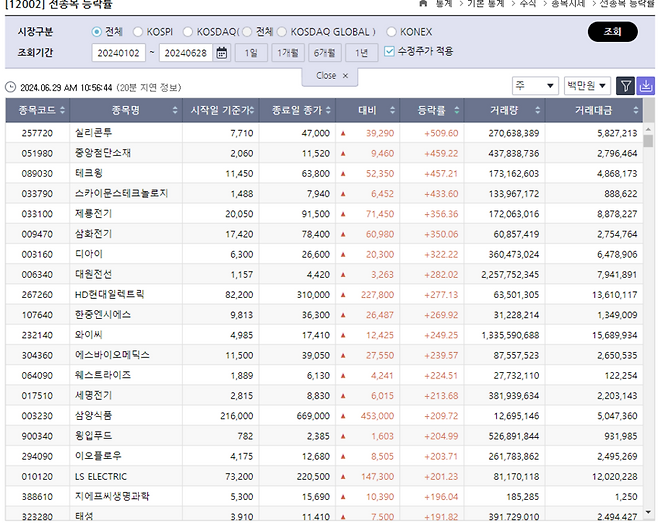 오늘(29일) 한국거래소에 따르면 화장품 유통 업체 실리콘투는 지난 28일 기준 지난해 말보다 509.6% 오르면서, 코스피와 코스닥시장에서 올 상반기 가장 높은 상승률을 기록했습니다.