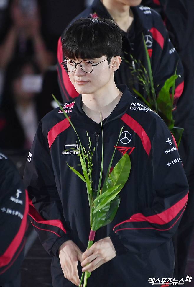 (엑스포츠뉴스 고양, 박지영 기자) 29일 오후 경기도 고양 소노 아레나에서 열린 '2024 LCK 서머 T1 홈 그라운드' T1과 KT 롤스터의 경기, T1 '페이커' 이상혁이 배우 박보영에게 선물받은 장미꽃을 들고 무대를 내려가고 있다.
