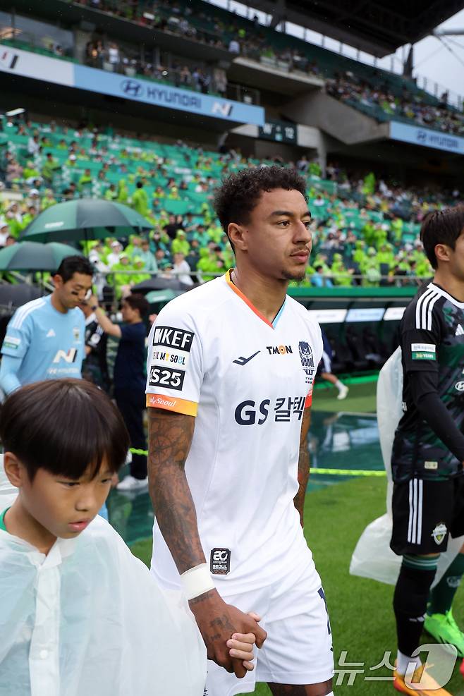 (전주=뉴스1) 박정호 기자 = 29일 오후 전북 전주시 덕진구 전주월드컵경기장에서 열린 하나은행 K리그1 2024 20라운드 전북현대와 FC서울의 경기에서 주장 완장을 찬 서울 린가드가 피치로 나오고 있다. 2024.6.29/뉴스1