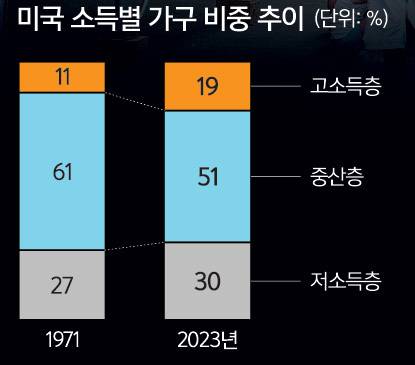 여론조사기관 퓨리서치센터도 지난달 30일 발표한 여론조사에서 미국의 중산층에 속한 미국인 비율은 1971년 61%에서 2023년 기준 51%로 감소했다고 밝혔다. 저소득층 인구는 같은 기간 27%에서 30%로 늘었고, 고소득층 인구도 11%에서 19%로 늘었다. 늘어나는 저소득층과 고소득층 사이에 중산층 비중이 갈수록 줄어들고 있는 셈이다. 빈부격차가 심화하고 있다는 의미도 된다.