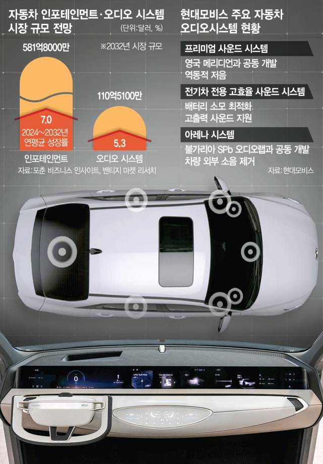 차량용 오디오 시장은 인포테인먼트의 고도화와 함께 꾸준한 성장세를 보일 것으로 전망된다. 글로벌 시장조사 업체인 포춘 비즈니스 인사이트에 따르면 전 세계 자동차 인포테인먼트 시장 규모는 올해 338억 5000만 달러(46조 7800억 원)에서 2032년 581억 8000만 달러(80조 4048억 원)로 연평균 7% 성장률을 기록할 것으로 전망된다. 차량용 오디오 시스템 시장은 같은 기간 연평균 5.3% 성장해 2032년 110억 5100만 달러(15조 2725억 원)에 달할 것이라는 분석도 있다.