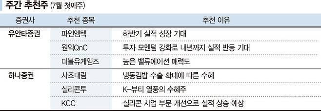 6월 30일 유안타증권은 2·4분기는 물론 하반기 실적 성장이 기대되는 파인엠텍을 추천종목으로 꼽았다. 금융정보업체 에프앤가이드에 따르면 2·4분기 파인엠텍의 영업이익은 105억원으로 전년동기 대비 36.86% 늘어날 전망이다. 하반기에는 삼성전자 폴더블 스마트폰 플립향 외장 힌지 진출과 3공장 완공에 따라 매출 증가가 기대된다. 올해와 내년에 시장 기대치를 웃도는 실적을 낼 것으로 기대되는 원익QnC도 추천 목록에 포함됐다. 올해부터 내년까지 메모리반도체 시설투자(Capex) 재개가 본격화 될 것으로 전망되는 등 투자 모멘텀 강화가 실적에 긍정적으로 작용할 것이란 분석이다.